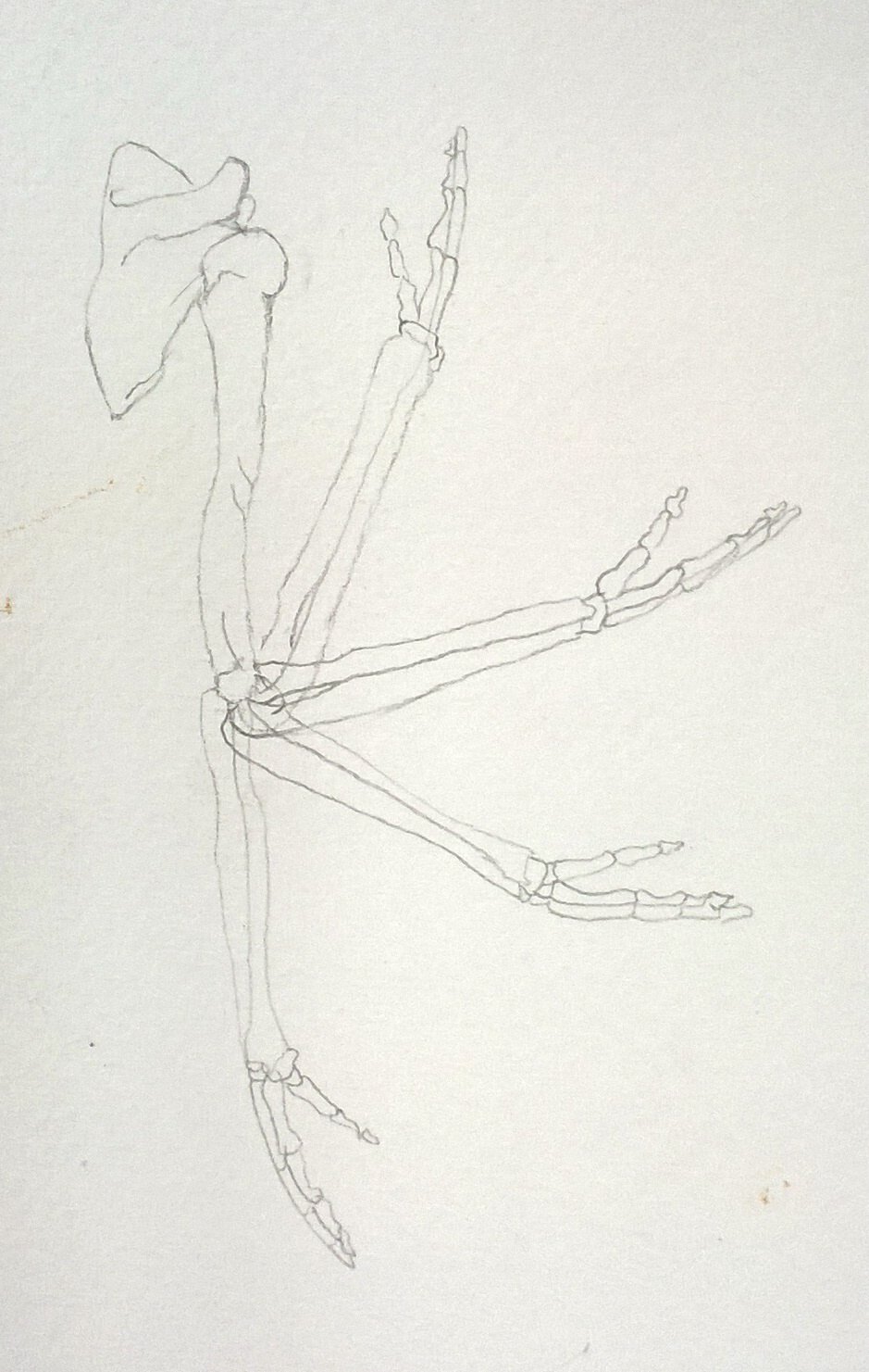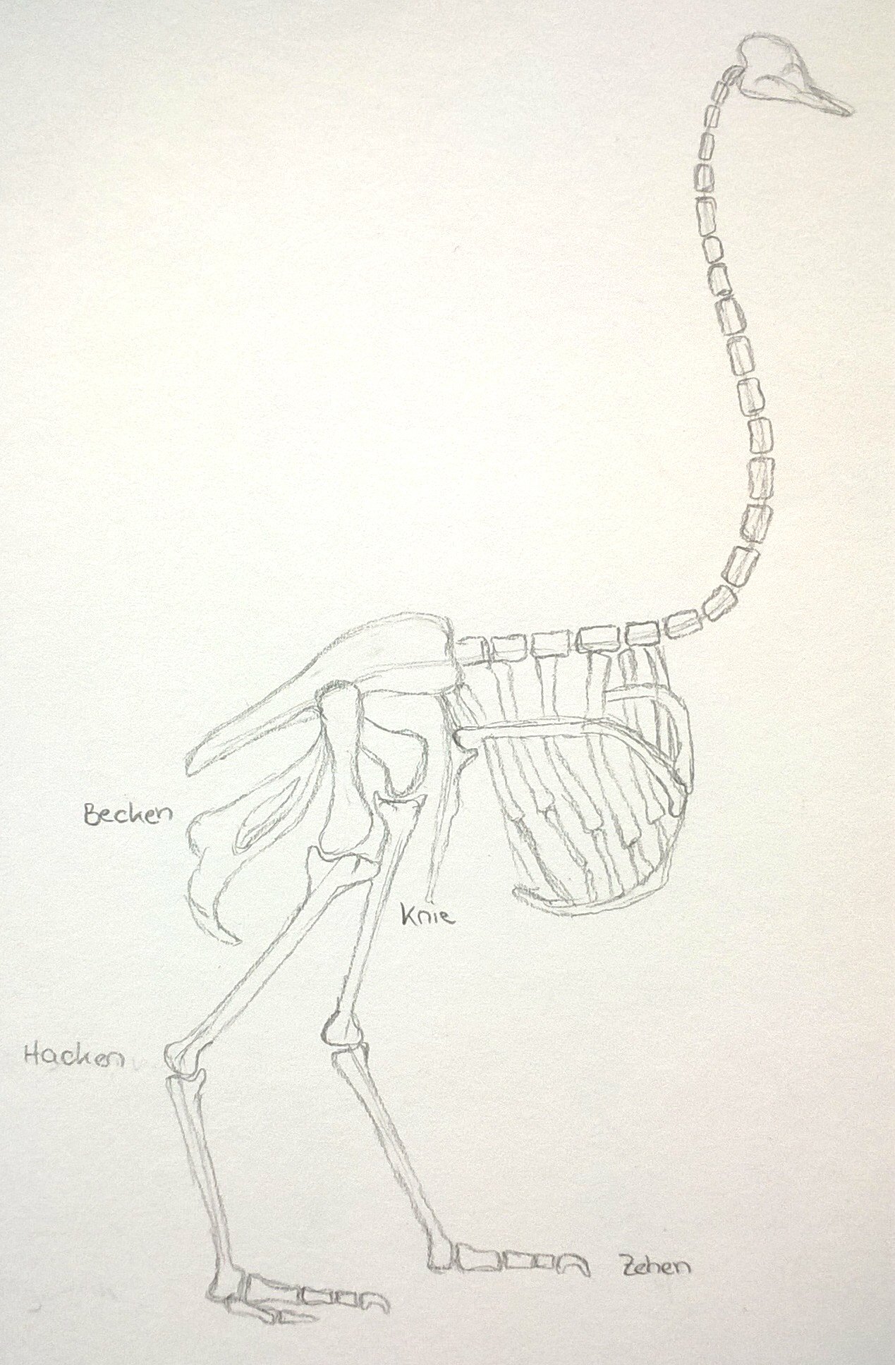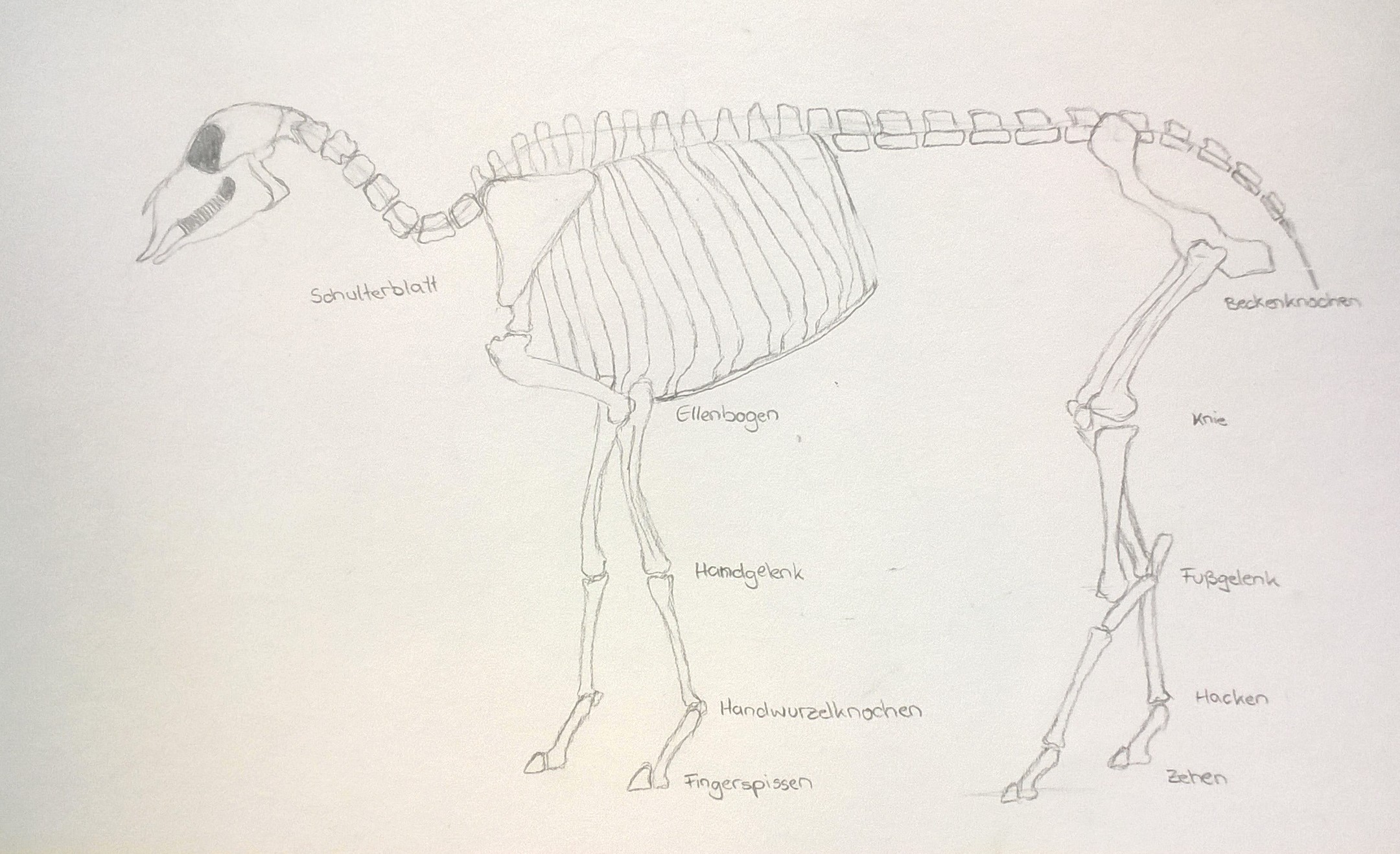 Die Skellette sind nach einer Vorlage im Buch gezeichnet. Anschließend war die Aufgabe, an Fotos lebender Tiere zu erahnen, wie der Knochenbau darunter aussehen müsste: Wo ist das Knie, wo der Hacken, wo der Ellenbogen? Dabei ist es eher unwichtig, wie jeder Knochen im einzelnen aussieht, denn woher sollte man das wissen? Doch der schematische Körperbau, auf den es hier ankam, ist den Schülern erstaunlich gut gelungen. Schließlich traut man im allgemeinen solche Aufgaben erst Erwachsenen im Hochschulstudium zu.