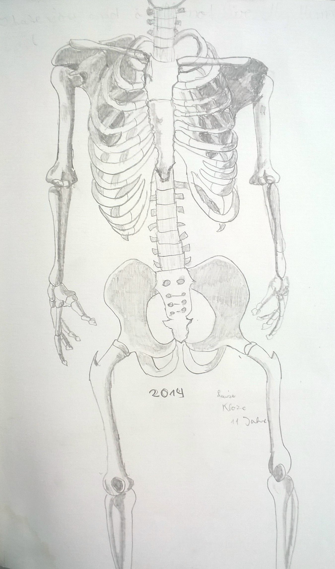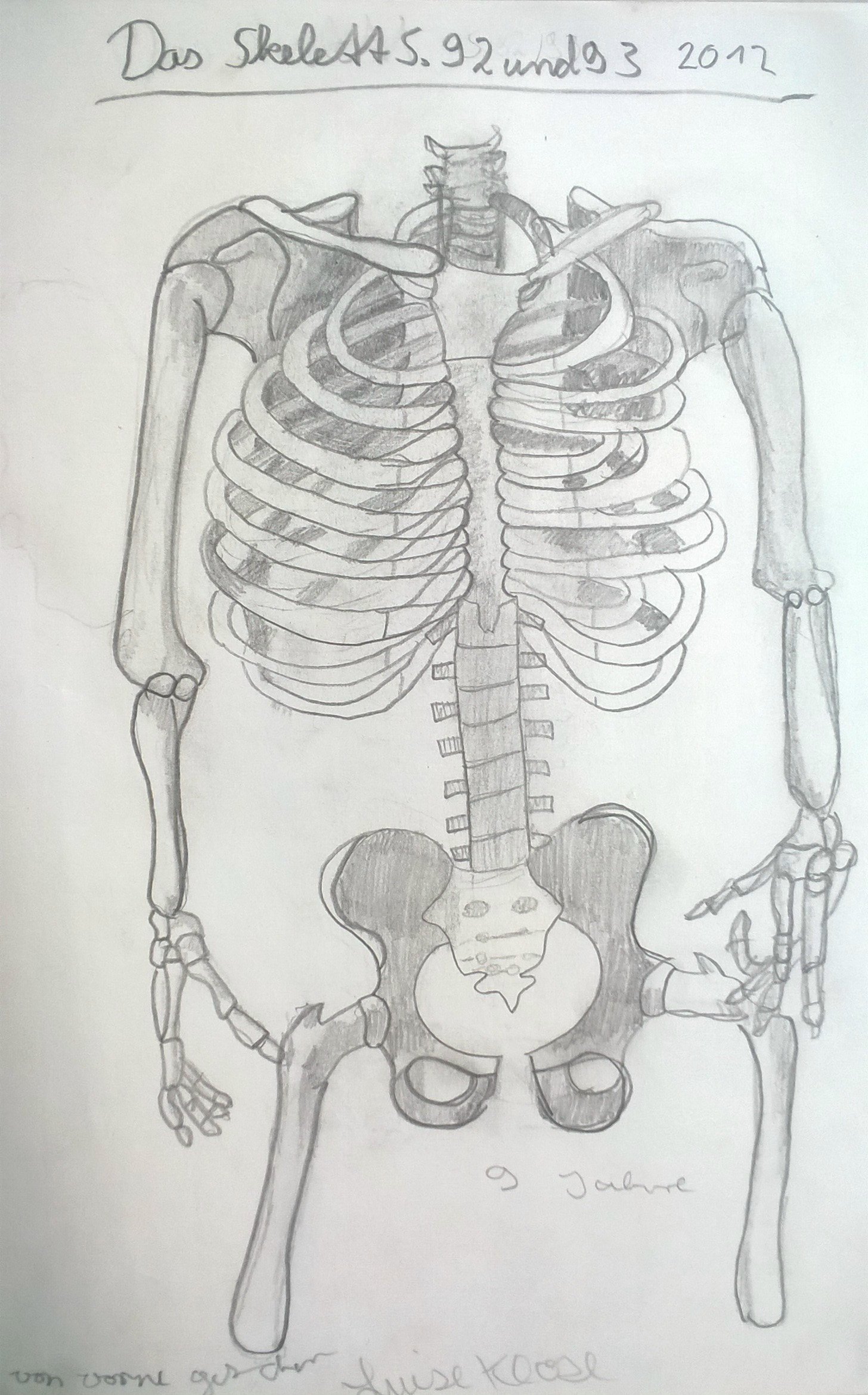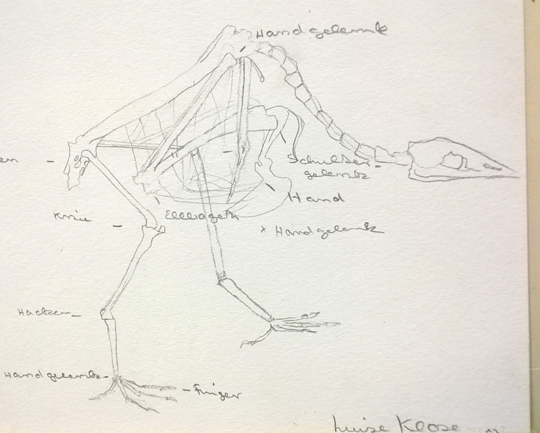 Die Skellette sind nach einer Vorlage im Buch gezeichnet. Anschließend war die Aufgabe, an Fotos lebender Tiere zu erahnen, wie der Knochenbau darunter aussehen müsste: Wo ist das Knie, wo der Hacken, wo der Ellenbogen? Dabei ist es eher unwichtig, wie jeder Knochen im einzelnen aussieht, denn woher sollte man das wissen? Doch der schematische Körperbau, auf den es hier ankam, ist den Schülern erstaunlich gut gelungen. Schließlich traut man im allgemeinen solche Aufgaben erst Erwachsenen im Hochschulstudium zu.