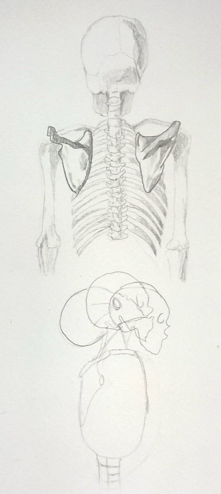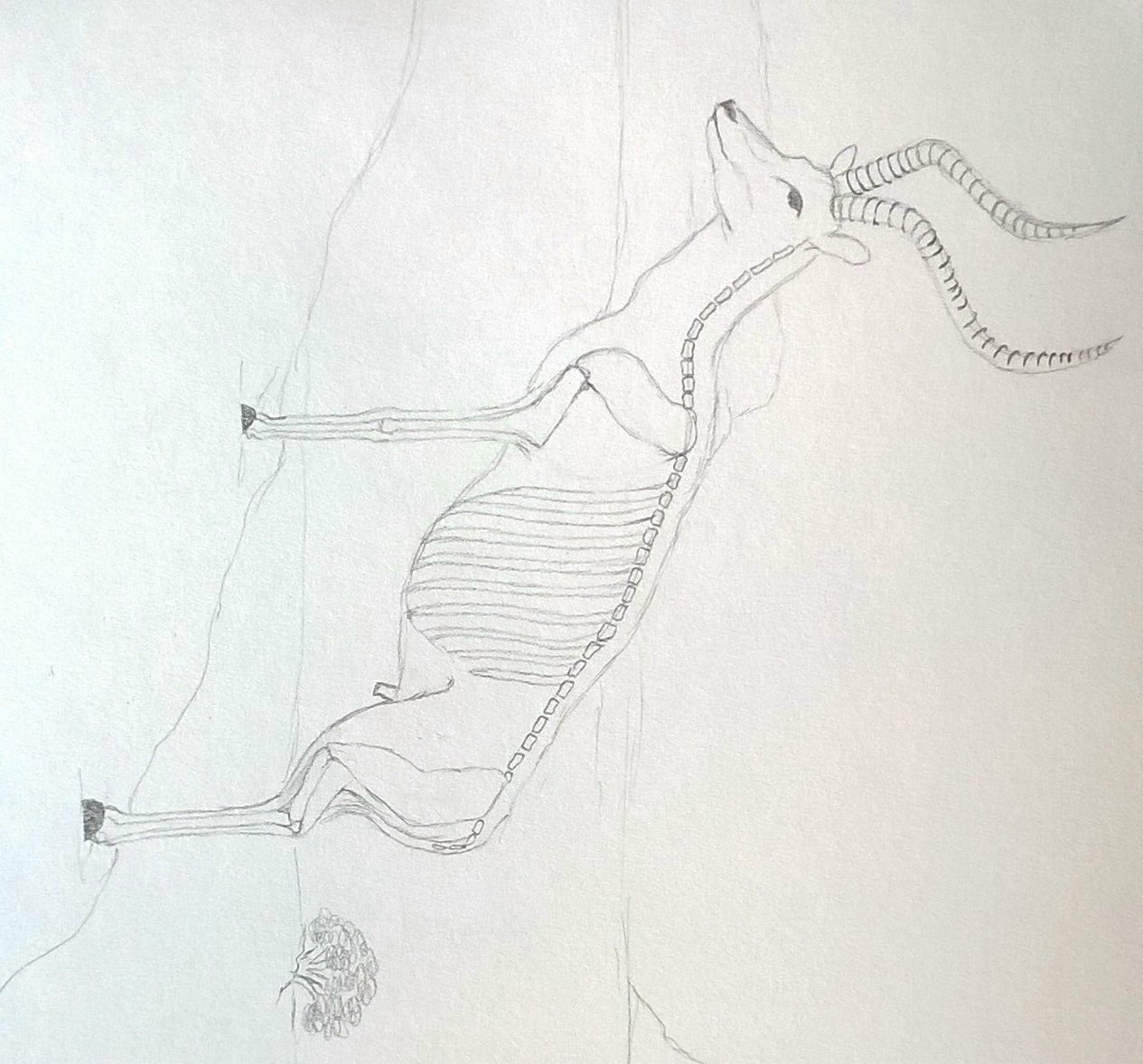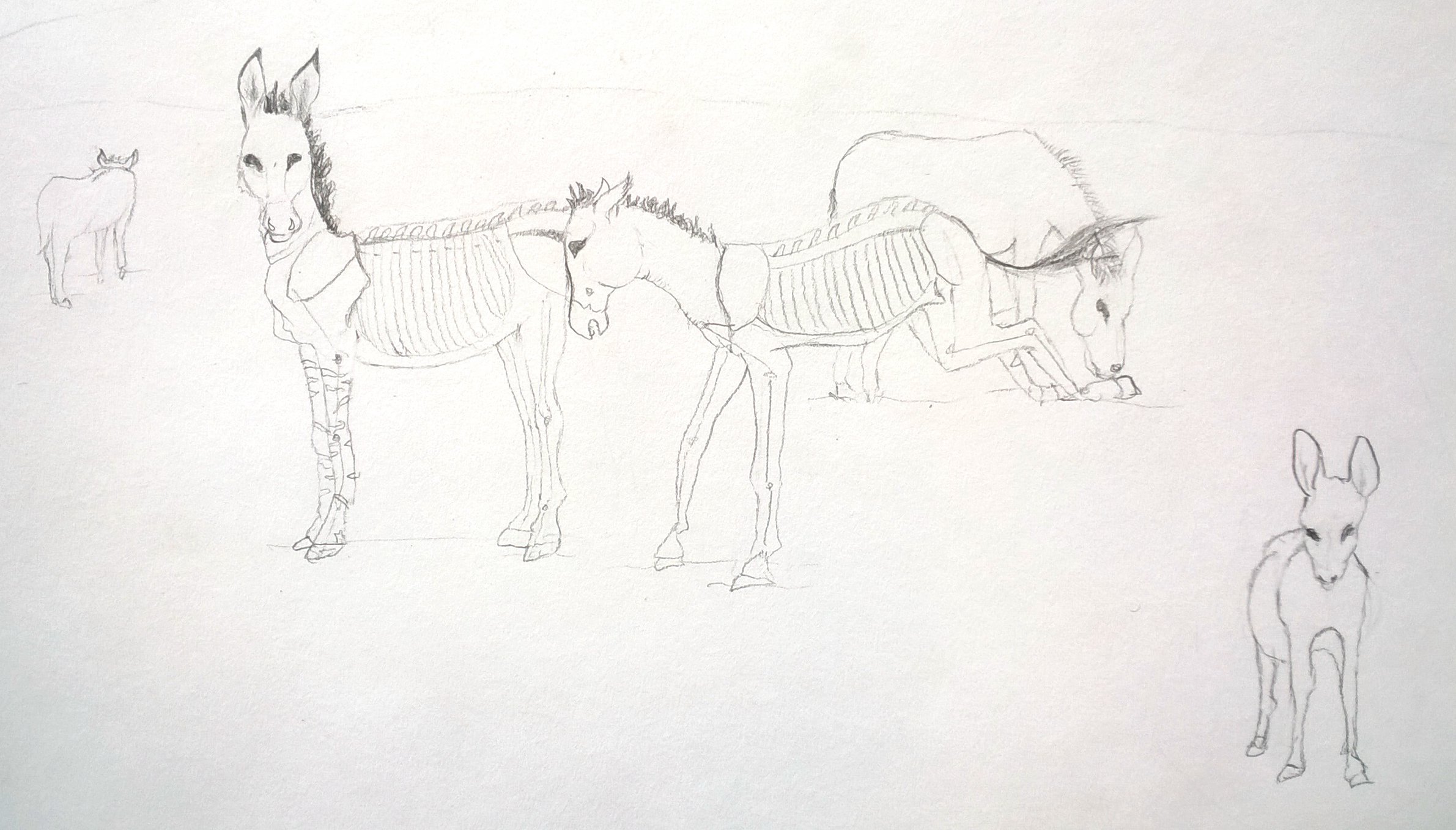 Die Skellette sind nach einer Vorlage im Buch gezeichnet. Anschließend war die Aufgabe, an Fotos lebender Tiere zu erahnen, wie der Knochenbau darunter aussehen müsste: Wo ist das Knie, wo der Hacken, wo der Ellenbogen? Dabei ist es eher unwichtig, wie jeder Knochen im einzelnen aussieht, denn woher sollte man das wissen? Doch der schematische Körperbau, auf den es hier ankam, ist den Schülern erstaunlich gut gelungen. Schließlich traut man im allgemeinen solche Aufgaben erst Erwachsenen im Hochschulstudium zu.