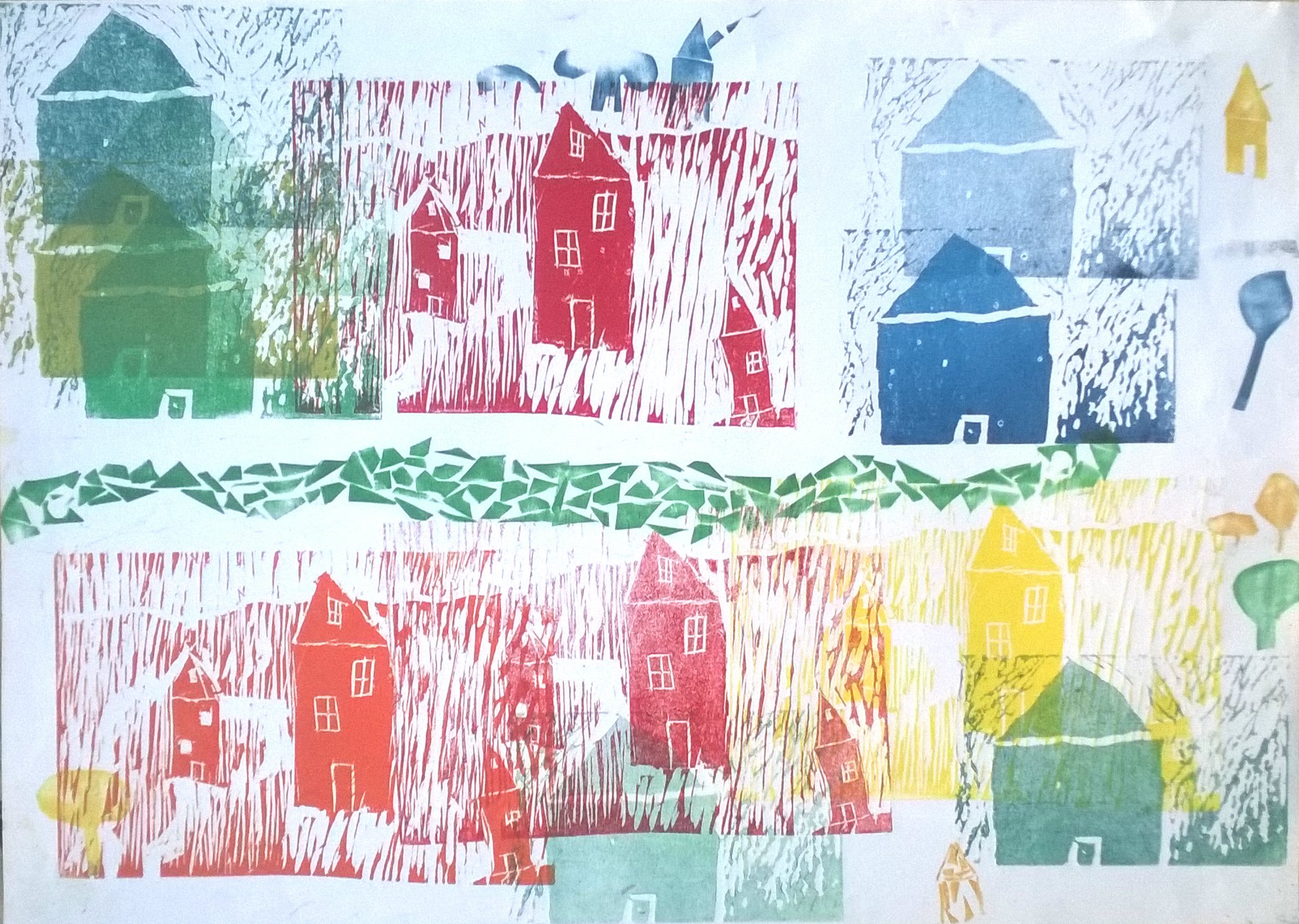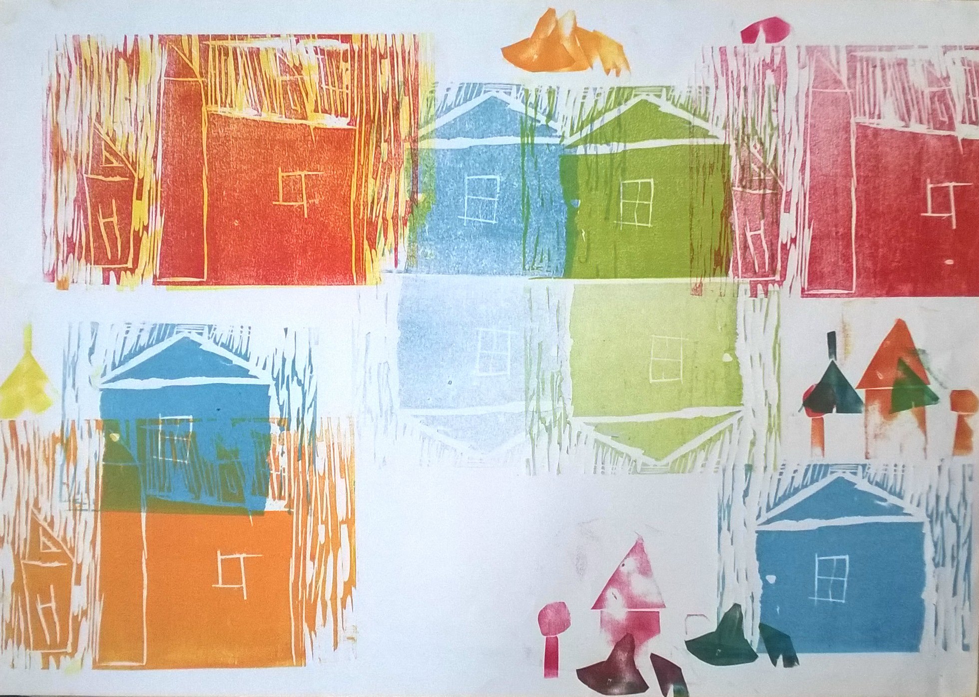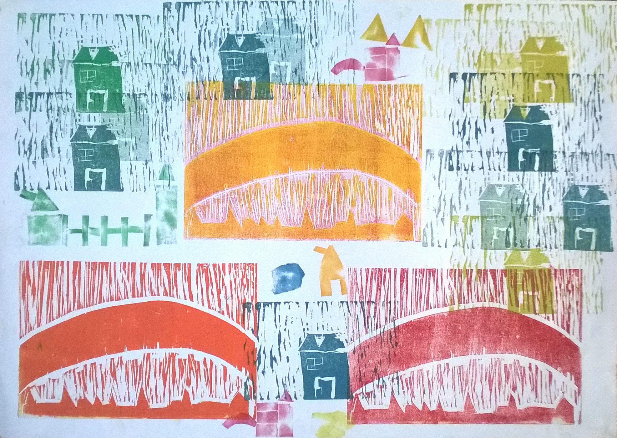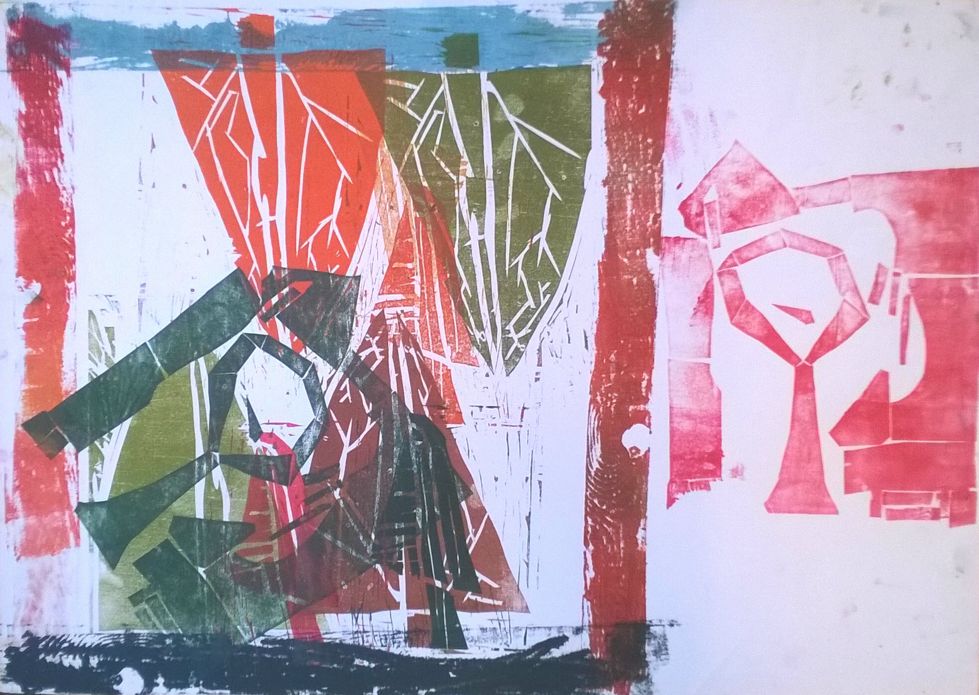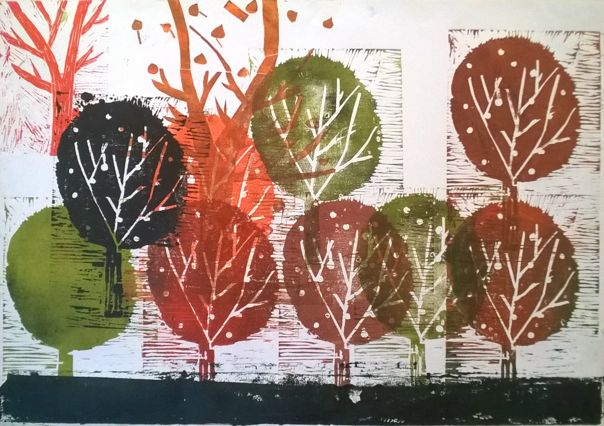 Anschließend kam ein kleinerer Baum hinzu, in Linoleum geschnitten, und auf dieselbe Art mehrfach gedruckt wie der Holzschnitt.