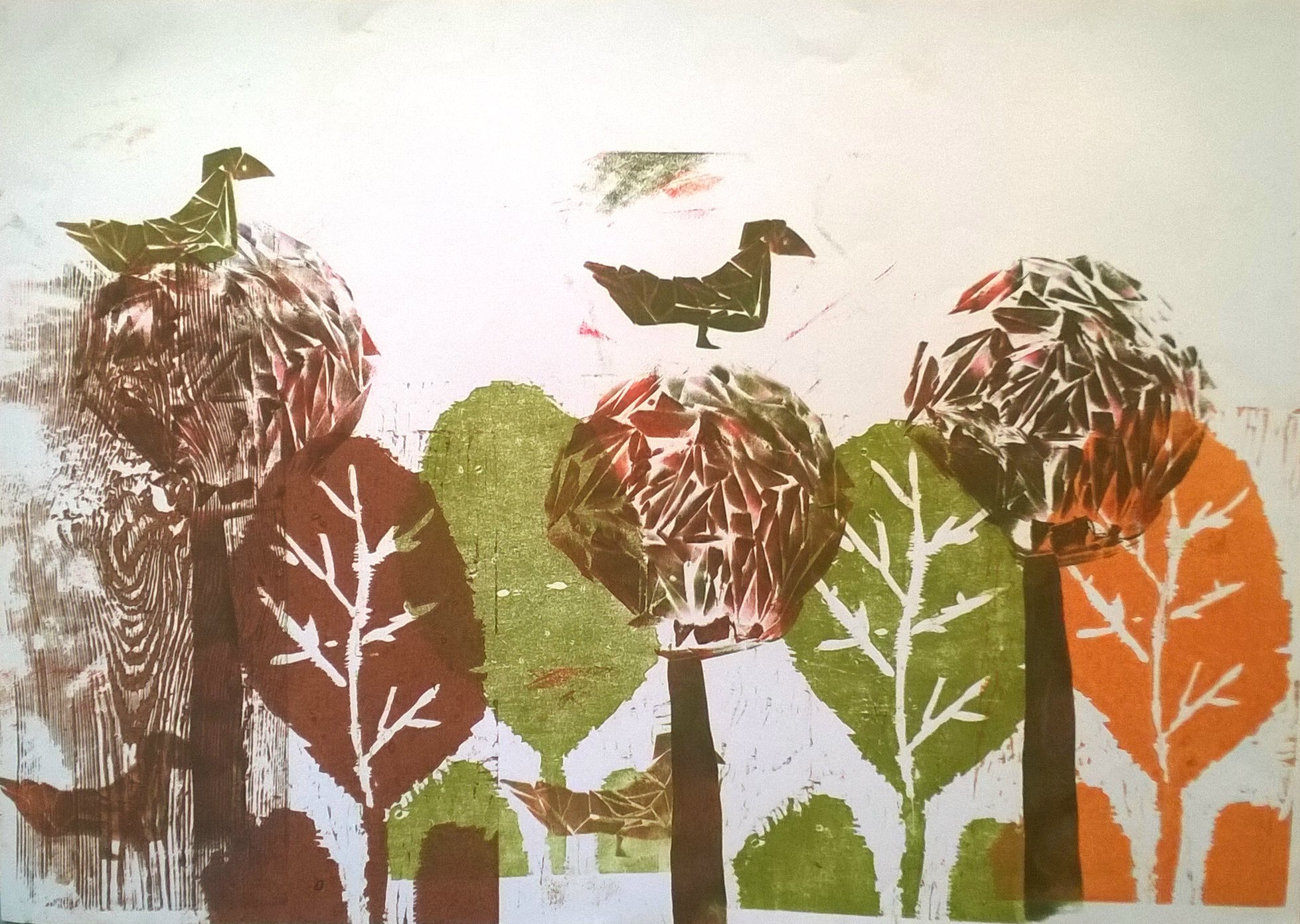 Jeder SChüler hat zuerst einen Baum in eine Holzplatte geschnitten und an der Zylinderdruckpresse an eine beliebige Stelle ins Bild gedruckt.